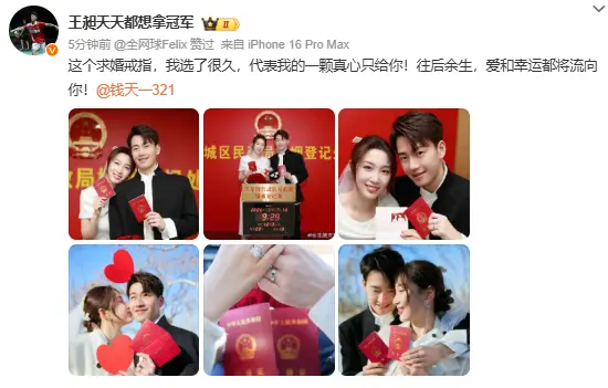첸톈이 역시 자신의 소셜 플랫폼을 통해 짧지만 진솔한 소감을 남겼다. 그는 “생일 소원이 당신과 결혼하는 것이었는데, 눈을 뜨자마자 현실이 됐다”고 밝히며 기쁨을 드러냈다.